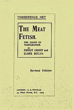 Crosby's essay was again published in 1905, along with an additional essay by Reclus, and sold as a pamphlet entitled The Meat Fetish: Two Essays on Vegetarianism, by the English publishing house of Arthur C. Fifield, at 53 Chancery Lane, London. It was printed by A. Bonner, at 1 & 2 Took's Court. The pamphlet was billed as two "able essays against flesh-eating" by the publisher, appearing in the advertisement section of the work Where Men Decay.[11] A new edition, which was 32 pages in total length, was printed in the same year by A. C. Fifield at 44 Fleet Street, E. C., London.[12] This edition was also part of the Humanitarian League New Series.[13] The cost of one pamphlet was 3 pennies, with ½ penny for postage.[12]