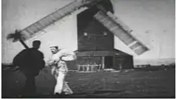The Miller and the Sweep was one of Smith's earliest productions, having built his first film camera the previous year.[1] It was filmed in a single shot on 24 July 1897 in front of Race Hill Mill on the South Downs, north of Brighton Racecourse, and then re-filmed on 24 September - it is probably this latter version that has survived.[2][3] These two versions are mentioned in Smith's cash book. There is no mention of the first print from July being sold.[3] It is likely that the film was rehearsed before filming, as this was Smith's usual way of working with fiction films.[3] The names of the actors are unknown, as with many films from the period, and it is not clear whether they are professional actors, music hall performers, comedians, or simply amateurs.[4]