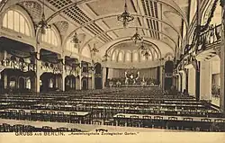 Menchen obtained the sole rights and film rights from Reinhardt and from Bote & Bock (Vollmöller's and Humperdinck's publishers),[24][25] and had "gone to very considerable expense" (£20,000[3] or $50,000)[1] "in preparing a film of the play, which he intended to produce with Mr. Walter Hyman"[n 2] at the Covent Garden Opera House on 21 December."[24] Another name (possibly a financial backer) appearing in connection with the production is that of A. D. Rosenthal.[26] The 'Lyricscope play' was designed to be a partial re-creation (on a slightly smaller scale) of Reinhardt's massive theatrical spectacle which had drawn such large crowds to Olympia the previous year.