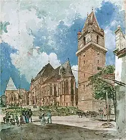 Shooting of The Miracle began on location in and around the parish church[37] of Perchtoldsdorf, near Vienna, on 6 October 1912, immediately after the stage production had ended its 3-week run at the Rotunde.[38][39] The small town's population was almost outnumbered by the cast of around 800 actors, who at mealtimes ate at long tables in the street.[3]
