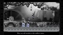 The game is visually presented in a manner reminiscent of a silent film, reminiscent of art nouveau or films from the late 1800s/early 1900s. As such there is no spoken dialogue, as all speech is instead shown through title cards in between stages. The game is also shown in mostly black-and-white and features a score primarily composed of piano-centric arrangements bearing a style similar to those of silent-era films.