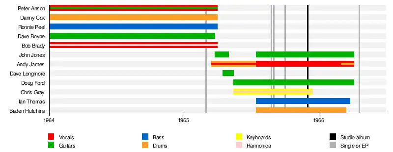 The Missing Links reformed before the end of July with Anderson and Jones joined temporarily by Dave Longmore on vocals and guitar, Frank Kennington on vocals and Col Risby on guitar.[5] Longmore was soon replaced by Doug Ford with Chris Gray joining on keyboards and harmonica,[5] Baden Hutchens on drums and Ian Thomas on bass guitar (both ex-Showmen) completed the line-up of the second version, which was "even more fierce version than the first".[8][3] During live performances, Anderson would climb walls to hang from rafters, then drive his head into the drums, other band members smashed guitars into speakers and all wore the latest Carnaby Street clothes.[4][5]