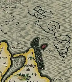 The Mixon rocks have been a great hazard to shipping vessels over the centuries.[a] [5] The cartographer John Speed placed the Mixon (incorrectly), off the north-east coast of the Isle of Wight on his 1610 map. [2][6] Probably the earliest[b] sailing directions about this area are in the "Great Britains Coasting Pilot" for 1693, where the author Greenvile Collins writes of the Mixon and Owers shoals: