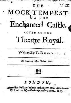 The Mock Tempest, or the Enchanted Castle is a Restoration era stage play, a parody by Thomas Duffet; it premiered in 1674, and was first printed in 1675 by the bookseller William Cademan. In creating his farce, Duffet's target was not Shakespeare's famous play, but the adaptation of it that John Dryden and Sir William Davenant wrote in the 1660s.[1][2][3] According to critic Michael West, "There are frequent nautical metaphors, and 'more noyse and terrour than a Tempest at Sea'...."[4]