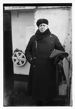 Brecht's form of the ‘Modern Theatre' was a reaction against the conventional style of performance, particularly Konstantin Stanislavski’s naturalistic approach.[23] Although both Brecht and Stanislavsky opposed the manipulative plots of traditional theatre and the heightened emotional baggage that came with melodrama, Stanislavsky's method to engender real human behaviour influenced Brecht's theoretical practice as he saw Stanislavsky's system as a framework for producing escapism.[24]