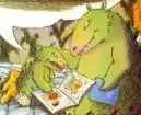 Dennis is a polite,[3] green, cave-dwelling reptilian monster that resembles a Velociraptor. As the main character of the story, he has many human-like features, such as smiling,[10] walking,[10] and emotion.[11] The monster has two objects he carries around with him, his teddy bear and pillow.[12] He is given these objects to give the reader an impression of a small child. Dennis also possesses several toys. These toys resemble the characters of another children's book, Where the Wild Things Are.[13] Dennis also plays hopskotch near his cave.[10]