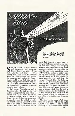 ![]() Title page of "The Moon-Bog" as it appeared in Weird Tales, June 1926. Illustration by Ed Whitham.[1] | |