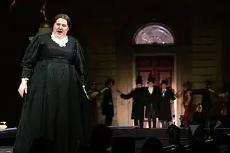 The opera premiered on 7 May 1947 at Columbia University's Brander Matthews Hall with soprano Dorothy Dow as Susan B. Anthony.[7] Soprano Shirlee Emmons was awarded an Obie Award for her portrayal of Susan B. Anthony in the 1956 Off-Broadway production.[8] The opera was mounted at Carnegie Hall by the American Opera Society in 1964 with Johanna Meier as Susan B. Anthony, Betty Allen as Anne, Thomas Paul as Daniel Webster, and Enrico Di Giuseppe as John Quincy Adams.[9] The Santa Fe Opera mounted the work in 1976 and released a recording of the work the following year on the New World Records label. The European premiere took place in Kensington Town Hall in London on 26 June 1979.[7] The New York City Opera staged a production in 2000 with Lauren Flanigan as Susan B. Anthony. In 2003, San Francisco Opera opened its 80th anniversary season with a new production of The Mother of Us All, Luana DeVol assuming the role of Susan B. Anthony for the first time.[10]