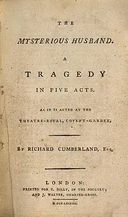 The Mysterious Husband is a play by the British writer Richard Cumberland. It is a Domestic drama with a tragic ending, first performed in 1783. Along with several other Cumberland plays it was influenced by the 1768 gothic play The Mysterious Mother by Horace Walpole.[1]