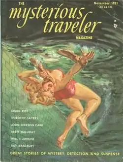 Grace Publishing's 1951–52 Mysterious Traveler digest-sized magazine ran for five issues with cover paintings by famed pulp illustrator Norman Saunders. The publisher was David Kogan, and managing editor Robert Arthur also contributed many stories.[1] The first issue (November 1951) carried a welcome from the Mysterious Traveler himself: