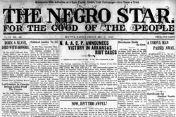 ![]() Front page of The Negro Star on December 17, 1920, announcing the NAACP's declaration of victory in the "Arkansas riot cases" | |