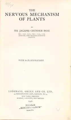 Published in 1926, the book "The Nervous Mechanism of Plants" by Jagadish Chandra Bose was revolutionary as he was one of the first plant biologists to be recognised for his research on the nervous system of plants.[2] He had already achieved recognition for his endeavours in physics where he studied optical properties of radio waves, but transitioned into plant physiology.[8] At the time, his discoveries were extremely progressive and not compatible with contemporary ideas, sparking much dispute, skepticism and criticism from the public.[2] They believed that his attempts to interlink the idea of electromagnetism and living plants were antagonistic at best.[9] The Western paradigm at the time was deeply rooted in the belief that cognition was only present in animals and not plants, which led to much of this skepticism as Bose attempted to prove the opposite.[10] In India, the colonial education system did not value scientific studies. In 1835, Macaulay proposed the government funding should go to studies in the liberal arts and not science.[11] This also contributed towards the lack of recognition toward the book at the time. For the next few decades after publication, little research in the field was done in order to investigate Bose's findings until after the 1950s.[12] In time, these discoveries were gradually accepted by other plant physiologists and researchers across the globe.[13] After publication, Bose's views on plant mechanics gained support from numerous Nobel Laureates such as Huxley, Shaw and Einstein.[13] Racism during the 1920s also impacted how Bose's work was accepted by the public. Bose was a physics professor at the Presidency College in Calcutta. Getting this job in order to further his botanical studies in order to write the book was a challenge as he needed to be appointed by Lord Ripon who believed that Indians were not capable of studying science.[10] Racism was also prominent in his job as he only received one third of the salary of an Englishman occupying the same position.[14] Due to this, many people were skeptical about his credibility and therefore did not accept his ideas. The opposition of Bose and many of his ideas had more to do with prejudice against his ethnic group and racism rather than the actual scientific content, yet it still influenced the reception of the book in a negative manner as people refused to consider his discoveries.[15] After his transition to plant electrophysiology, The Royal Society would not publish his papers which resulted in his work not being acknowledged more widely.[16]