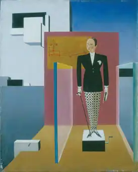 Sándor Bortnyik falls among the representatives of Constructivism. From 1922 to 1924, he lived in Weimar, where he met artists from the Bauhaus. He painted abstract two- and three-dimensional compositions, to which he subsequently added figures and objects. In the composition The New Adam he describes an ironic ideal of "modern" man in the 1920s. It shows an extremely fashion-conscious man who is fragile, like clockwork. With this and other paintings, Bortnyik ironically applied the "brave new world" of constructivism. The artist uses precise details, geometric shapes and colors in abstract composition. He manages to satirize utopian ideals, but cannot avoid them because he is an active participant in the formation of a "new world“.[2]