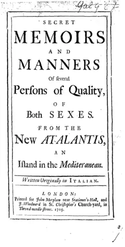 The New Atalantis (full title: Secret Memoirs and Manners of Several Persons of Quality, of both Sexes, From The New Atalantis) was an influential political satire by Delarivier Manley published at the start of the 18th century. In it a parallel is drawn between the exploitation of females and the political deception of the public.