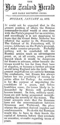 The New Zealand Herald was founded by William Chisholm Wilson, and first published on 13 November 1863. Wilson had been a partner with John Williamson in the New Zealander, but left to start a rival daily newspaper as he saw a business opportunity with Auckland's rapidly growing population.[9] He had also split with Williamson because Wilson supported the war against the Māori (which the Herald termed "the native rebellion") while Williamson opposed it.[10] The Herald also promoted a more constructive relationship between the North and South Islands.[10]