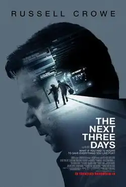 The Next Three Days is a 2010 American crime thriller film written and directed by Paul Haggis, starring Russell Crowe and Elizabeth Banks. A remake of the 2008 French film Pour elle (Anything for Her) by Fred Cavayé, the plot follows a husband who takes extreme measures to break his wife out of prison after she is wrongfully convicted for the murder of her boss.[3][4]