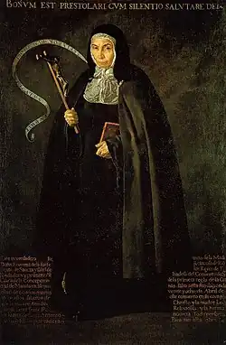 Velázquez's painting is significant in detailing the nun's aged physical features while simultaneously capturing her sainthood. Vicente Carducho writes in his 1633 treatise on art, Diálogos de la Pintura, that Jerónima "evokes the legitimate love of parents, siblings, relatives, or friends" and would help ease the pain of absence felt by the "house of nuns" in Toledo.[12] The religious imagery in Jerónima, in particular the presence of the crucifix, alludes to her "rigorous imitation of Christ's passion" – according to a fellow nun Ana, Jerónima would display "penitence with a cross", sometimes even to the extent of crucifying herself for hours.[11] Similarly, the Latin inscriptions in the portrait reference her piousness and adherence to the Poor Clares' practice of not speaking excessively or unnecessarily.[13] The depiction of Jerónima's well-documented and radical practice of self-mortification, however, is conspicuously left out in the portrait;[14] contrary to contemporaneous accounts of the nun that speak of her "dry and denigrated" body "full of scars and wounds", Jerónima in Velázquez's portrait is not scarred or wounded.[15] In fact, she is seen as "unscathed" and standing upright with an "unyielding" gaze, which reinforces her "authoritative presence".[16]