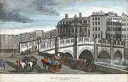 In 1769, the Freeman's Journal published a proposal to link College Green and Gardiner's Mall (modern day O'Connell Street) by way of new streets and a new bridge, but the presence of the Custom House upriver at Essex Bridge meant that no bridge could be built lower down the river as it would block trade.[25]