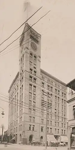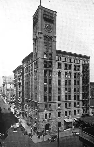 The Oregonian Building was a building in downtown Portland, Oregon, United States, which served as the headquarters of Portland's major newspaper, The Oregonian, from 1892 to 1948. It was the first steel-framed building constructed in the Western U.S.,[3] and from its opening until 1911 it was the tallest building in Portland.[4] In addition to the newspaper's offices and printing press, in 1922 the building became the home of Portland's first commercial radio station, KGW, which was owned by the Oregonian Publishing Company. A second radio station, KEX, was acquired by the paper in 1933, and joined KGW in new, shared studios in the Oregonian Building. A fire in 1943 forced the radio stations to relocate. The company sold the building in December 1947 as it prepared for a move to a larger building. In June 1948, the newspaper moved to a new building on Southwest Broadway, also called the Oregonian Building. The 1892 building with the landmark clock tower then stood vacant for about two years until it was demolished, in 1950.