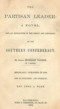In 1861, it was reprinted in New York City by Rudd & Carleton with the title A Key to the Disunion Conspiracy, further adding of the book that it was "Secretly Printed in Washington (in the year 1836) ... but afterwards suppressed".[2][3] Northerners presented the book as proof that Southerners had been planning their succession for decades.[1] A Confederate edition was published in Richmond in 1862 by West & Johnston. The Confederate edition was also retitled, but to The Partisan Leader: A Novel, and an Apocalypse of the Origin and Struggles of the Southern Confederacy, suggesting that the book was literally prophetic.[4]