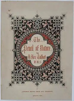 The cover page of The Pencil of Nature eclectically clashed the Baroque, Celtic, and Medieval styles, as was characteristic of the Victorian era.[7] Its symmetrical design, letterforms, and intricate carpet pages are similar to and a pastiche of the Book of Kells.