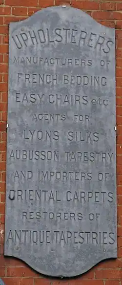 The firm of Amédée Joubert & Son provided services of upholstery, gilding, the importation of Aubusson tapestry, Lyons silks and oriental carpets and the manufacture of French bedding, chairs etc. and continued until 1932, lastly under Felix Joubert who also made dolls' house furniture for Queen Mary.[6] By 1914, however, the showroom was closed and the rest of the building rented out as studios with only the basement in use by the Jouberts as a workshop.[7]
