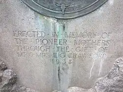 The memorial includes several inscriptions. One by the woman's foot reads, Avard Fairbanks / 1928. The medallion has two inscriptions: one below the wagon displays a copyright symbol and reads, 1928 Avard Fairbanks, while another says, THE / PIONEER / MOTHERS. On the concrete backdrop below the medallion is the signed inscription: ERECTED IN MEMORY OF / THE PIONEER MOTHERS / THROUGH THE GIFT OF / MR. & MRS. E. G. CRAWFORD / 1928.[2]