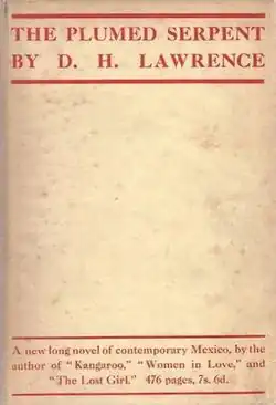 The poet Richard Aldington described The Plumed Serpent as "curious and original". He compared it to Frederick Rolfe's novel Hadrian the Seventh (1904), arguing that "in both books the author imagines himself raised to a position of power which he never had the faintest chance of attaining in fact on this earth." He suggested that the novel shows Lawrence's "dissenting horror from the very things he is supposed to be preaching." He interpreted Cipriano and Ramón as projections of D. H. Lawrence.[20] The writer Anthony Burgess maintained that The Plumed Serpent is the least liked of Lawrence's novels due to its lack of humour and its exploration of a theme of little interest to readers "with no knowledge of the ancient Aztec gods and what they could mean to a revitalized or Laurentianised Mexico." He called its ending unconvincing.[21] Leavis and Burgess have compared The Plumed Serpent to Kangaroo,[17][21] Burgess finding the similarity to be their shared emphasis on bloodshed.[21] Leavis maintained that unlike The Rainbow and Women in Love, but like Aaron's Rod (1922) and Kangaroo, The Plumed Serpent was "exploratory and experimental." Though appreciating features such as its bullfight scene, he dismissed it as a bad book and the least complex of Lawrence's novels, arguing that it suffered from his single-minded concern with imagining a "revival of the ancient Mexican religion."[17] Critics have offered differing interpretations of Kate Leslie.[20][17] Aldington and Burgess saw the character as a representation of Frieda Lawrence,[20][21] but Leavis maintained that Leslie was not a representation of Frieda Lawrence.[17] The critic Frederick Crews argued that the character was simply an opportunity for Lawrence to present "Lawrentian doctrine."[22]
