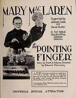 The Pointing Finger, also known as No Experience Required is a 1919 American silent drama film, directed by Edward A. Kull and Edward Morrissey. Morrissey began directing the project, but was replaced by Kull in late August or early September 1919. It stars Mary MacLaren, David Butler, and Johnnie Cook, and was released on December 1, 1919. There are no known archival holdings of the film, so it is presumably a lost film.[2]
