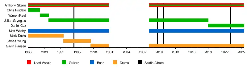 - Anthony "Skenie" Skene – vocals, guitars (1986–2000, 2008–present)