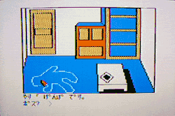 With no keyboard, the Famicom version replaces the verb-noun parser with a menu list of fourteen set commands selectable with the gamepad.[1] This is similar to the command selection menu system introduced in Yuji Horii's murder mystery adventure game The Hokkaido Serial Murder Case: The Okhotsk Disappearance [ja], which was released in 1984,[8] in between the PC and Famicom releases of Portopia. One of the commands on the menu allowed the player to use a point-and-click interface, using the D-pad to move a cursor on the screen in order to look for clues and hotspots.[1][4] The Famicom version of Portopia also features branching menu selections, which includes using the pointer as a magnifying glass to investigate objects, which is needed to find hidden clues, and as a fist or hammer to hit anything or anyone, which could be used to carry out beatings during suspect interrogations.[2][4] Additional sequences were also added, notably an underground dungeon maze,[1] with a style similar to role-playing video games.[9]