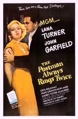 The Postman Always Rings Twice is a 1946 American film noir directed by Tay Garnett and starring Lana Turner, John Garfield, and Cecil Kellaway. It is based on the 1934 novel of the same name by James M. Cain.[3] This adaptation of the novel also features Hume Cronyn, Leon Ames and Audrey Totter. The musical score was written by George Bassman and Erich Zeisl (the latter uncredited).[4]