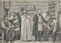 All of the Khanzhonkov Tolstoy films shared similar stylistic elements. They were intended for audiences already familiar with the adapted works, and presented only a selection of key scenes without any context or transitions. The intention was to illustrate the play in a manner similar to lubok literature, rather than present the entire play on film. For The Power of Darkness, seven scenes were filmed.[1] These scenes occupied 365 meters of film, giving it a run-time of about twenty minutes,[1] and making it the longest domestically produced Russian film at the time of its première on 14 November 1909.[3][4]
