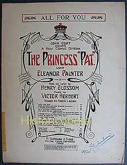 The Princess Pat is an operetta in three acts with music by Victor Herbert and book and lyrics by Henry Blossom. While set on Long Island, New York, the story follows the American born Princess di Montaldo, a.k.a. "Princess Pat" (formerly Patrice O'Connor), who is married to the Italian Prince Antonio di Montaldo, a.k.a. "Prince Toto". Unhappy that her husband ignores her, she is intent on winning back his attention and affections.[1] Herbert wrote the piece as a vehicle for the soprano Eleanor Painter.[2]