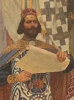 The Proclamation of Dušan's Law Codex (Serbian: Proglašenje Dušanovog zakonika, Serbian Cyrillic: Проглашење Душановог законика) is the name given to each of seven versions of a composition painted by Paja Jovanović which depict Dušan the Mighty introducing Serbia's earliest surviving law codex to his subjects in Skopje in 1349. The Royal Serbian Government commissioned the first version for 30,000 dinars in 1899, intending for it to be displayed at the following year's Exposition Universelle (world's fair) in Paris.