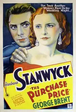 The Purchase Price is a 1932 pre-Code American romantic drama film directed by William Wellman and starring Barbara Stanwyck, George Brent and Lyle Talbot. Adapted from the novel The Mud Lark by Arthur Stringer, with a screenplay by Robert Lord, the film is about an attractive nightclub singer who leaves her criminal boyfriend and becomes the mail-order bride of a humble farmer.