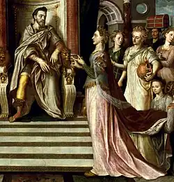 In the painting, Solomon, the ruler of the Kingdom of Israel, is represented with Philip II's features: black hair, a beard, a hanging lip and a pronounced chin.[6][7] His attire, including a laurel crown, is closer to that of a Roman emperor, and matches with Solomon's Temple looking more like a Roman temple in the background of his palace.[8] The throne has the typical attributes of Solomon's throne, with gold and ivory throne of Solomon, two lions beside the armrests and six steps (1 Kings 10, 19; and II Chron. 9, 18).[9]