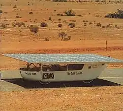 The project was promoted by adventurer Hans Tholstrup, with the Australian-made car developed by Larry Perkins and his brother Garry;[2] and sponsored by BP. In December 1982, the car, driven by Hans Tholstrup and Larry Perkins,[3] performed the first manned transcontinental journey using only solar power, traversing Australia from west to east.[4]