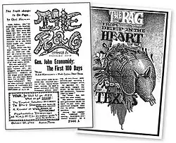 The Rag was an underground newspaper published in Austin, Texas from 1966–1977. The weekly paper covered political and cultural topics that the conventional press ignored, such as the growing antiwar movement, the sexual revolution, gay liberation, and drug culture. It encouraged these political constituencies and countercultural communities to coalesce into a significant political force in Austin.[1] As the sixth member of the Underground Press Syndicate and the first underground paper in the South, The Rag helped shape a flourishing national underground press.