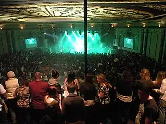 There is a large tiled-floored front lobby with marble accessories that slopes up into the main portion of the theatre, which contains a large blue and white domed ceiling, a grand balcony for VIP seating, a concession stand, wood paneled floors, and columned walls.[1] The interior design of the theatre has a vintage and historical look, adorned with crimson, gold, and black accents that match the original style of the 1920s.[1] There is a large, maple-wood bar in the back center of the theatre and a bar on the left side of the balcony as well. Offices, meeting rooms, and dressing rooms are located on the upper level of the theatre. Two large projector screens hang to the right and left of the stage, directly in front of the elevated floor sections.