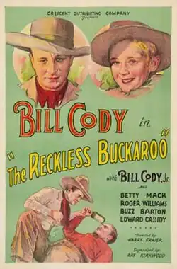 The Reckless Buckaroo is a 1935 American Western film directed by Harry L. Fraser and written by Zarah Tazil. The film stars Bill Cody, Bill Cody Jr., Betty Mack, Buzz Barton, Roger Williams and Ed Cassidy. The film was released on April 2, 1935, by Crescent Pictures Corporation.[1][2][3]