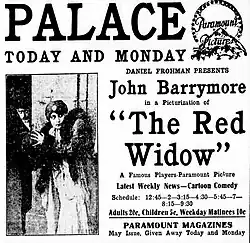 The Red Widow is a lost 1916 American silent romantic comedy film directed by James Durkin, produced by Famous Players–Lasky, and distributed by Paramount Pictures.[1] The film was based on a 1911 Broadway musical play The Red Widow by Channing Pollock and Rennold Wolf and starring comedian Raymond Hitchcock. John Barrymore stars in this film in the Hitchcock part of Cicero Butts. Hitchcock's wife, Flora Zabelle, is the leading lady in this film.[2][3][4][5]