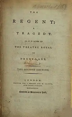 The Regent is a 1788 tragedy by the British author Bertie Greatheed. It premiered at the Theatre Royal, Drury Lane in London on 29 March 1788. The original cast included Sarah Siddons as Dianora, John Philip Kemble as Manuel, Richard Wroughton as Gomez, James Aickin as Solerno, John Hayman Packer as Gerbin, Robert Benson as Pedro, William Bates as Diego, Richard Wilson as Servant, John Phillimore as Banditti and Sarah Ward as Paula. The Irish premiere took place at the Crow Street Theatre in Dublin on 5 July 1788.[1] Although it was not a great success, it was nonetheless published and a German translation was issued in 1790.[2]