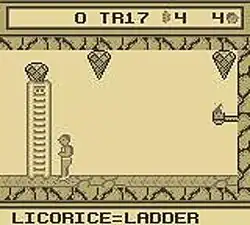 The Rescue of Princess Blobette tells the story of a young, male protagonist and his blob companion as they attempt to rescue the latter's girlfriend, the titular Princess Blobette.[4][5] The damsel in distress has been imprisoned by the antagonistic Alchemist within the highest tower of the Royal Castle on the planet Blobolonia. Like its predecessor, A Boy and His Blob: Trouble on Blobolonia, The Rescue of Princess Blobette is a puzzle-platformer in which the player directly controls the boy as he is followed around by the blob, who is controlled by the computer AI. The pair must navigate the various passages and floors of the castle to locate and free Blobette.[4] The boy can only run back and forth, cannot jump or swim, and will die if he falls a long distance or comes in contact with dangerous objects such as flamethrowers and sewer serpents.[5] The blob however can be made to turn into useful tools when he is fed jelly beans of various flavors.[5][6] Each flavor causes a different transformation. For example, feeding the blob a tangerine jelly bean will change him into a trampoline, which the boy can then use to reach high platforms.[4] The player may also locate extra jelly bean sacks and numerous, optional treasures.[5] Finding five peppermints will increase the player's extra lives by one.[4]
