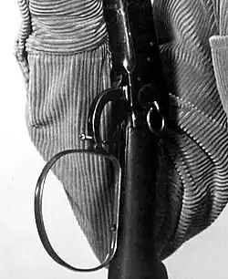 The trigger-trip screw pin was used in two configurations: with the screw head turned inside (close to the trigger), or more often, outside the trigger guard with a locknut on the outside (to secure its position). In some episodes, the screw was removed, when rapid-fire action was not required. When properly adjusted, the screw "squeezed" the trigger when the lever was fully closed. The rapid-fire mechanism was originally designed to keep Connors from puncturing his finger with the trigger as he quickly cycled the action of the rifle. With this modification, Connors pulling the trigger for each shot was not necessary, so he did not have to place his finger in harm's way. A close-up of the rifle's large looped lever and trigger-set screw can be seen in the third-season episode "Miss Bertie."