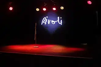 The club originally earned a reputation as one of Canada's hippest music clubs,[1] and many major Canadian comedy and musical performers have played on its stage, including The Kids in the Hall, Gordon Downie, The Frantics, Sean Cullen and the infamous Dark Shows. The Drowsy Chaperone premiered at the Rivoli and went on to subsequent productions and eventually a highly successful run on Broadway.