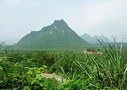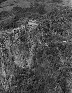 The Rockpile is located in Vietnam approximately 10 miles (16 km) from the southernmost boundary of the DMZ and 16 miles (26 km) west of Dong Ha. A Marine reconnaissance team described the cone shaped as a "toothpick-type mountain stuck out in the middle of an open area with a sheer cliff straight up and down".[1] The mountain rises almost 790 feet (240 m) from the Cam Lo River bottom and sits astride several major infiltration routes from North Vietnam and Laos. The visually dominating figure, which would come to be a familiar landmark for soldiers fighting the war for the DMZ, sits just one kilometer from the vital Route 9. Impressive as it was within the immediate vicinity, the Rockpile is overshadowed by other, much higher hills in nearly every direction. To the Rockpile's northwest is Dong Ke Soc mountain that stands at over 2,200 feet (670 m), to the direct north is Nui Cay Tri (later known as Mutter's Ridge after the radio call sign of the 3rd Battalion, 4th Marines who would defend it), and to the northeast is Dong Ha Mountain.[2] Atop the Rockpile is a plateau-like summit that is 40 feet (12 m) long by 17 feet (5.2 m) across at its widest point.[3]