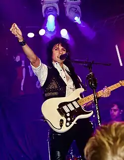 Sindre Langhelle (/ˈsɪndrɛ ˈlɑːŋhələ/; born August 3, 1990), known professionally as Rocky Kramer (/ˈrɒki ˈkrmər/), is a Norwegian-American guitarist, singer, songwriter, composer and bandleader from Trondheim who is now based in Los Angeles.[4] In 2018, Kramer became more widely known when he headlined the Seattle Hempfest.[5][6] The next year, he released the single "Rock Star" from his debut album Firestorm, together with a well-received animation over live-action music video,[7] exceeding a million views on Facebook.[8][9] "Rock Star" reached number 1 on the Global DRT Chart and was nominated for a Hollywood Music in Media Award.[10][11] Following release of Firestorm, Kramer performed at the 2019 Sturgis Motorcycle Rally in Sturgis, South Dakota,[12] before joining Buckcherry's tour throughout the United Kingdom.[1][2] Kramer has been described as "[o]ne of the strongest and most poignant guitarists since [Jimi] Hendrix."[13] In 2021, it was announced that Kramer had been cast to play the character "Lars Olsen" in the Aaron Lee Lopez directed feature film Rockin' in Time, due in theaters in 2025.[14][15][16][17] Kramer plays and endorses Fender Stratocaster guitars.[18] In February of 2024, Kramer returned to East West Studios in Hollywood, with a brand new band to record an upcoming album entitled "Alone In The Rain" along with the Rockin' In Time movie Soundtrack.[17]
