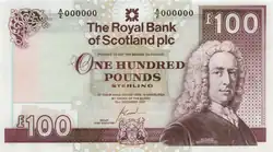 The Royal Bank of Scotland £100 note is a sterling banknote. It is the largest denomination of banknote issued by The Royal Bank of Scotland. The current cotton note, first issued in 1987, bears an image of Lord Ilay, one of the founders of the bank, on the obverse, and a vignette of Balmoral Castle on the reverse.