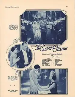The Sacred Flame is a 1929 sound (All-Talking) film directed by Archie Mayo, starring Pauline Frederick and Conrad Nagel, and based on a 1928 Broadway play of the same title by Somerset Maugham.[1] It is now considered a lost film.[2] Two years later Warner Brothers remade the film in German The Sacred Flame. In 1935, a second remake The Right to Live, was made, starring Colin Clive and George Brent.
